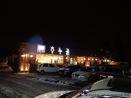 便利商店前,正好開始下雪了。白天在愛寶樂園時,導遊說氣象報下雪的機率很大,可是卻沒有。