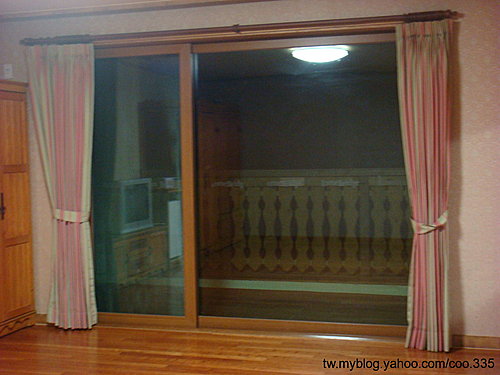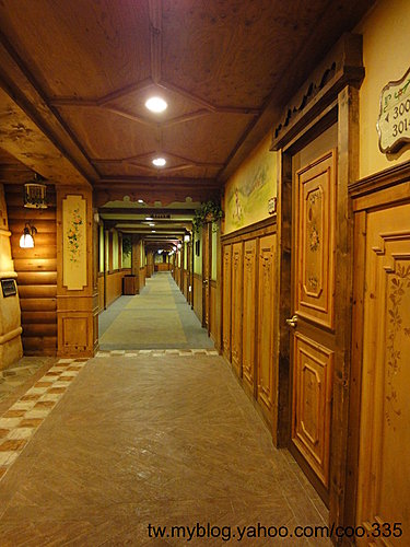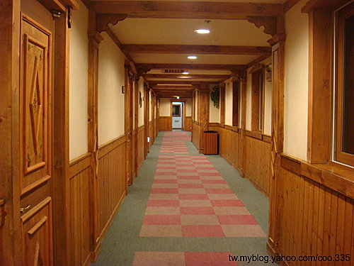 房間外的走廊。整棟的木頭,聞起來有淡淡的木香味。