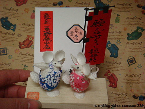 這一對老鼠很可愛吧!祝福語是寫在旗幟上的唷!